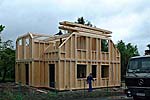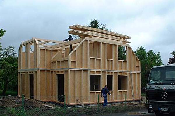 Die Bilder zeigen den Aufbau der Wandelemente und das fertige Haus.